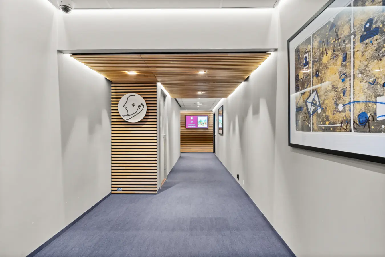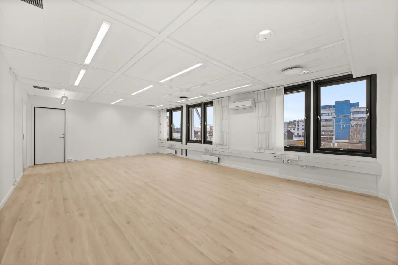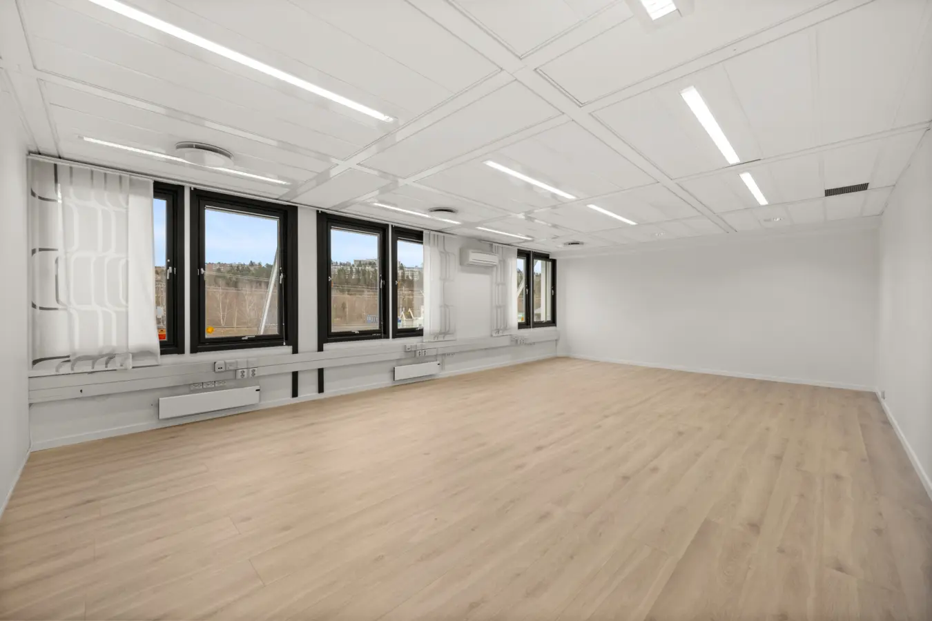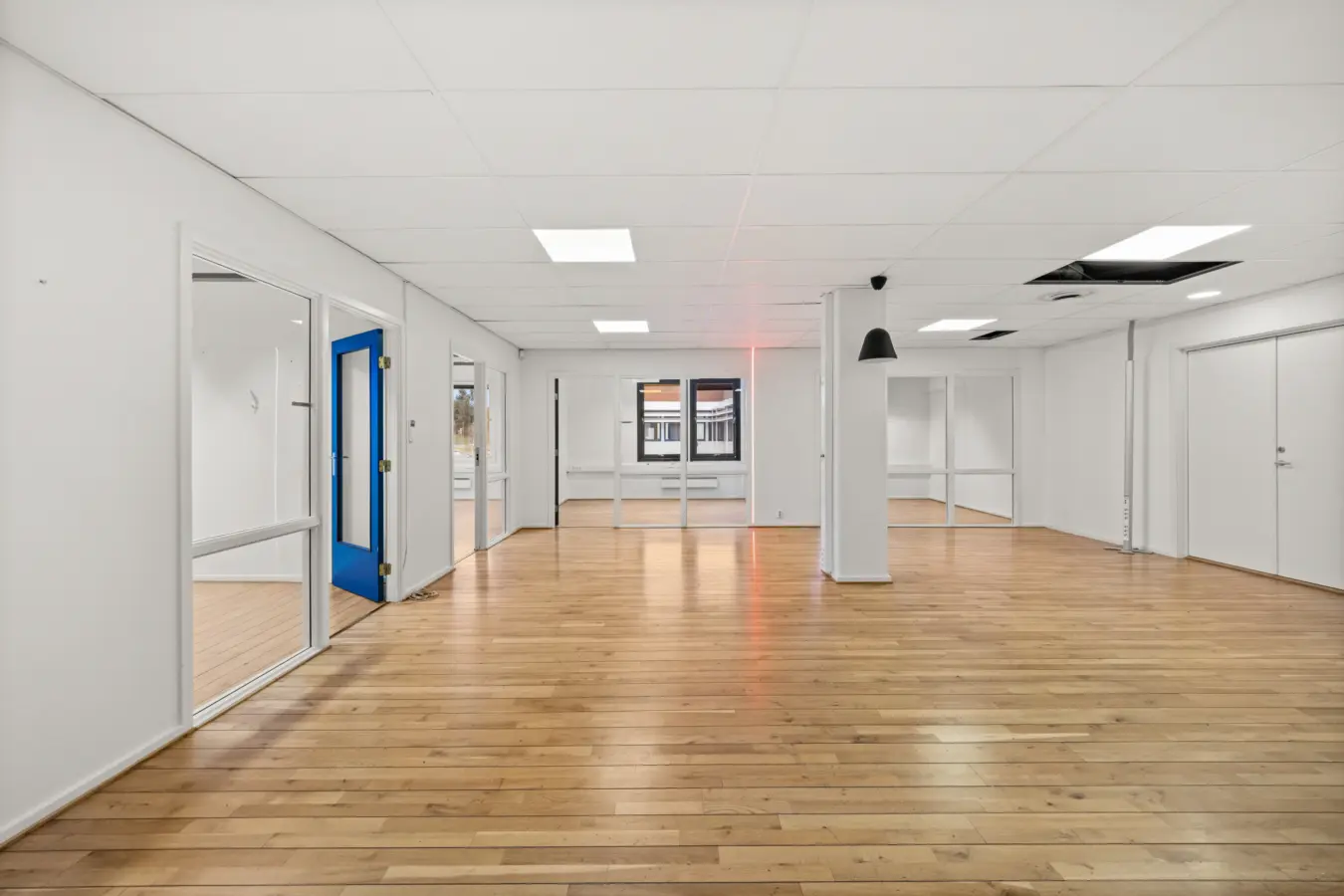 Åpent kontorlandskap for ca. 15-20 personer, 4 møterom av forskjellig størrelse og kjøkken.