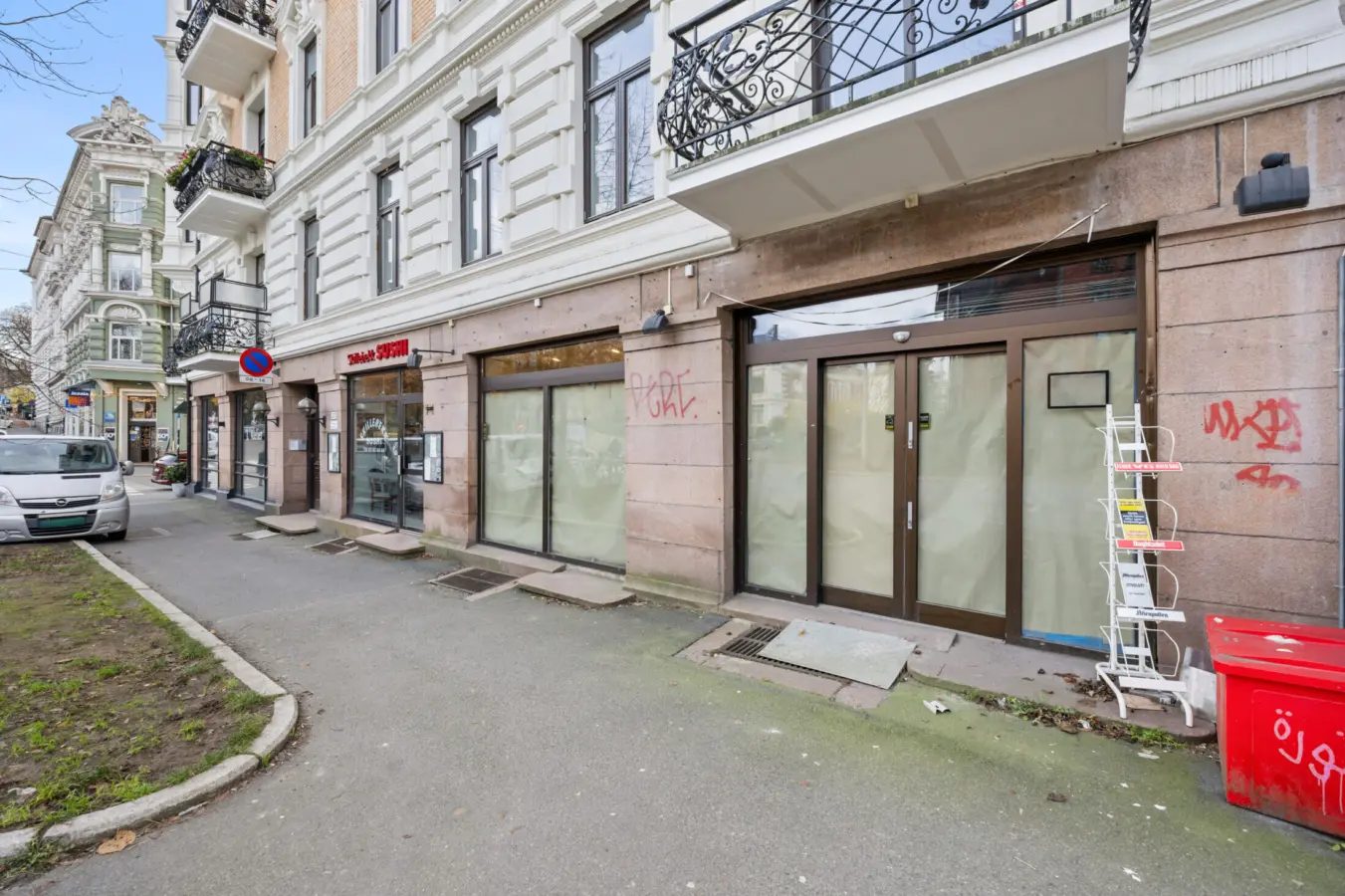 Lokalet har direkte adkomst fra gaten (automatiske skyvedører).