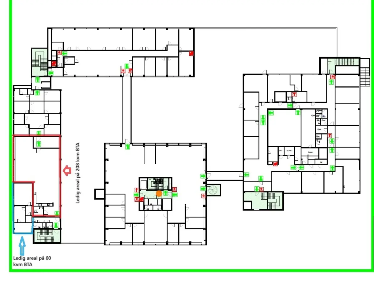 Kontor-/behandlingslokaler: På 60 og 208 kvm BTA. Arealet på 208 kvm BTA består av åpent landskapsareal, kjøkken, møterom og HCWC. Arealet på 60 kvm BTA. trenger oppussing og vil bli tilpasset etter leietakers behov. Felles toaletter i gangen.