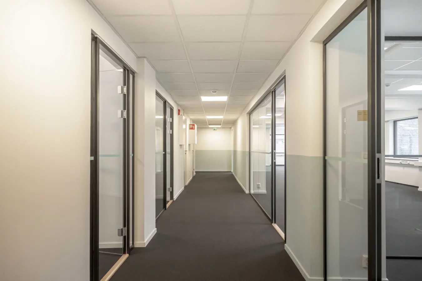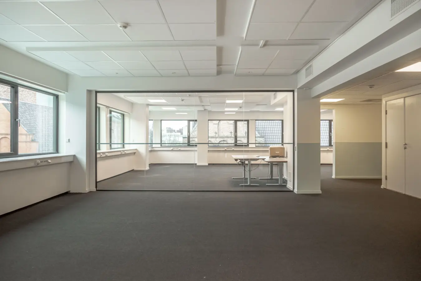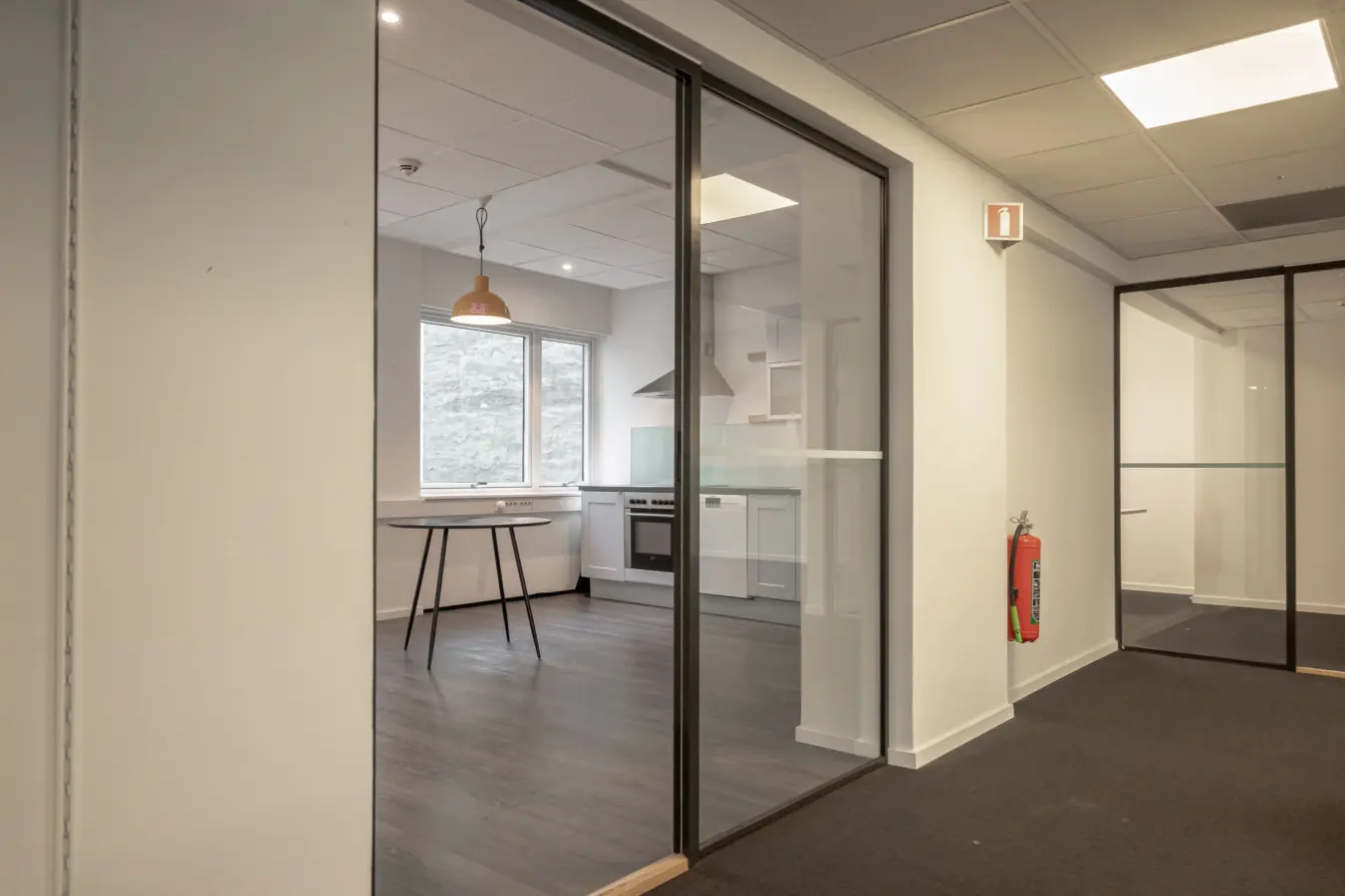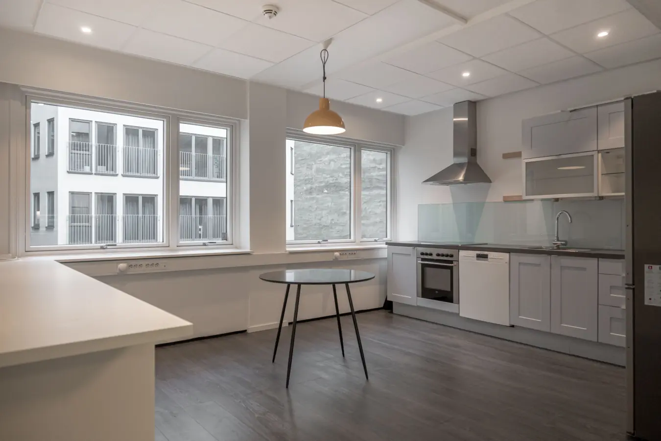 Fleksibelt kontorlandskap, cellekontorer, møterom, moderne kjøkken med spiseplass, toaletter, mm.