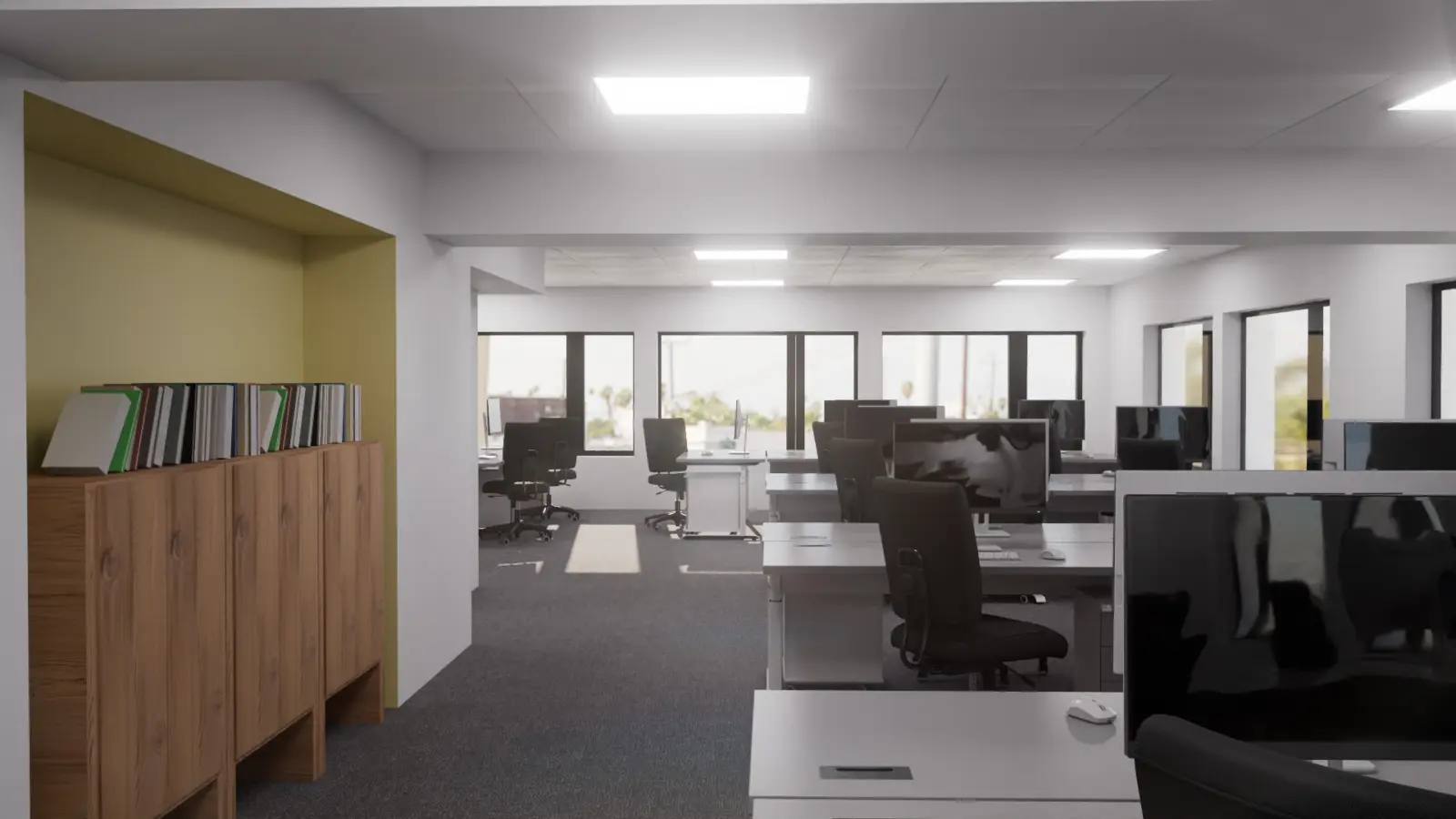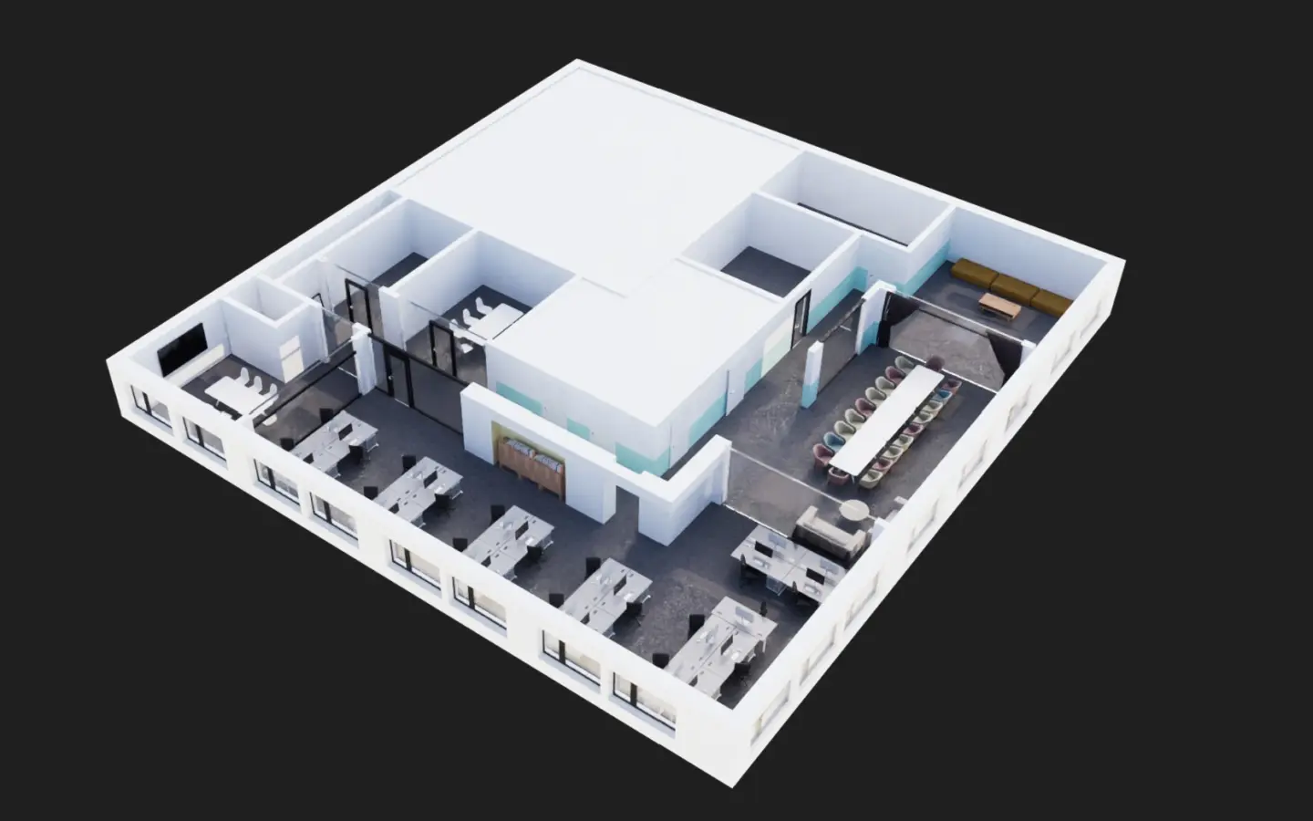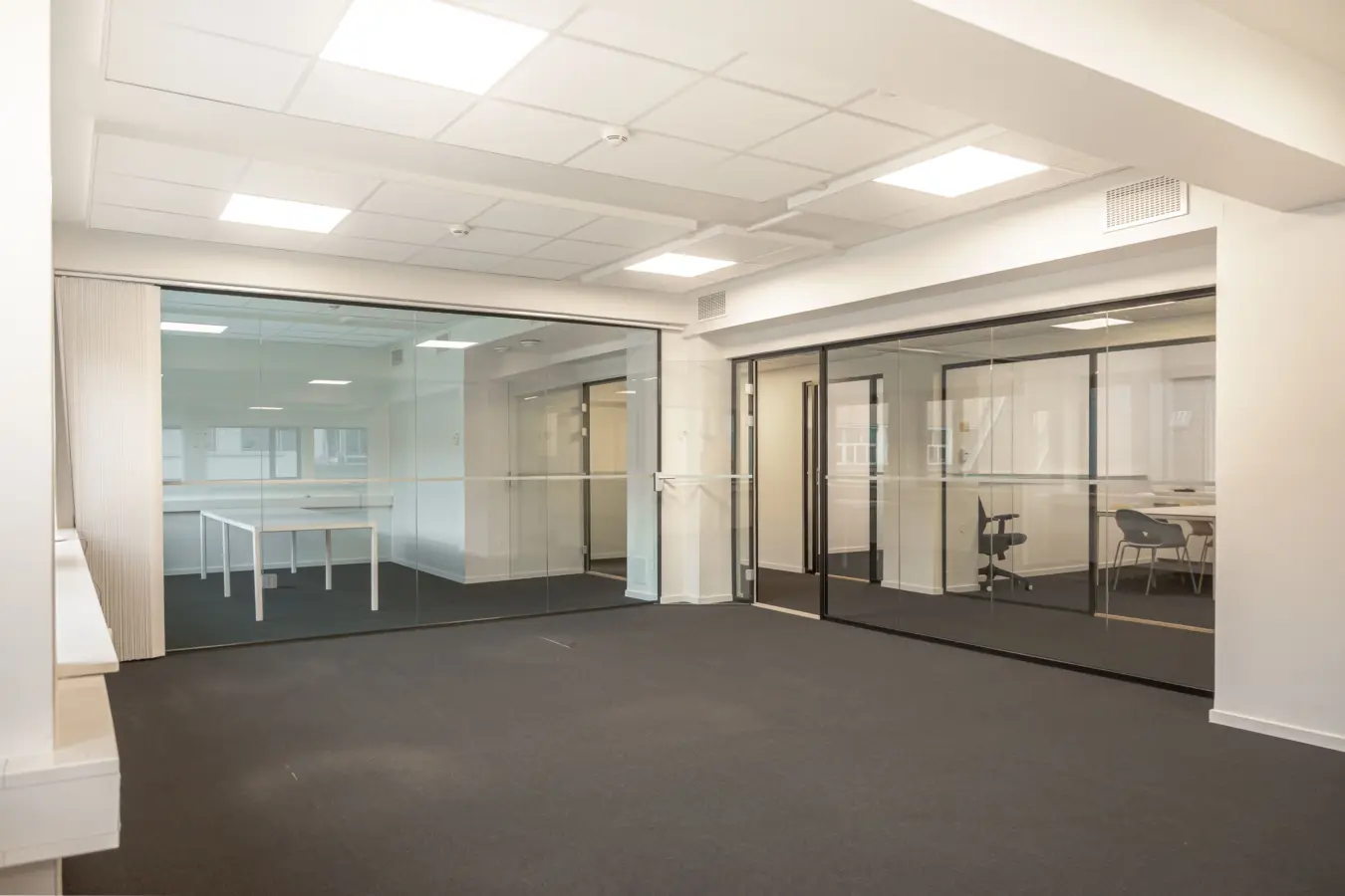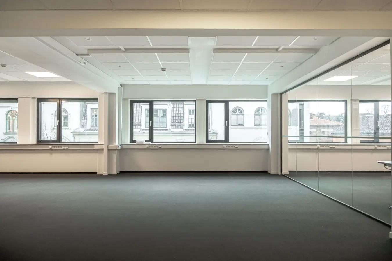 Fleksibelt kontorlandskap, cellekontorer, møterom, moderne kjøkken med spiseplass, toaletter, mm.