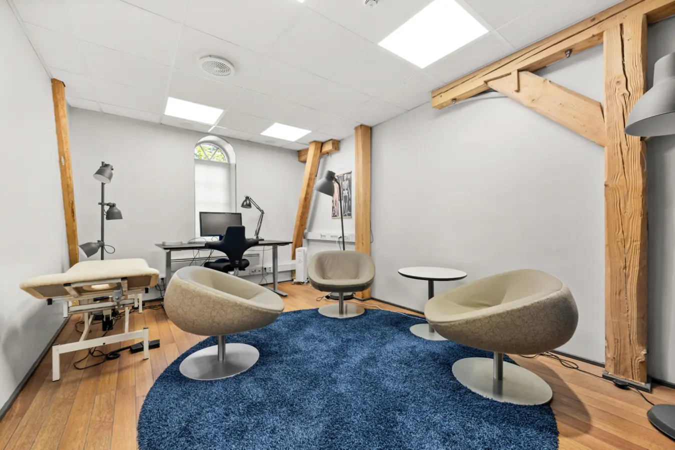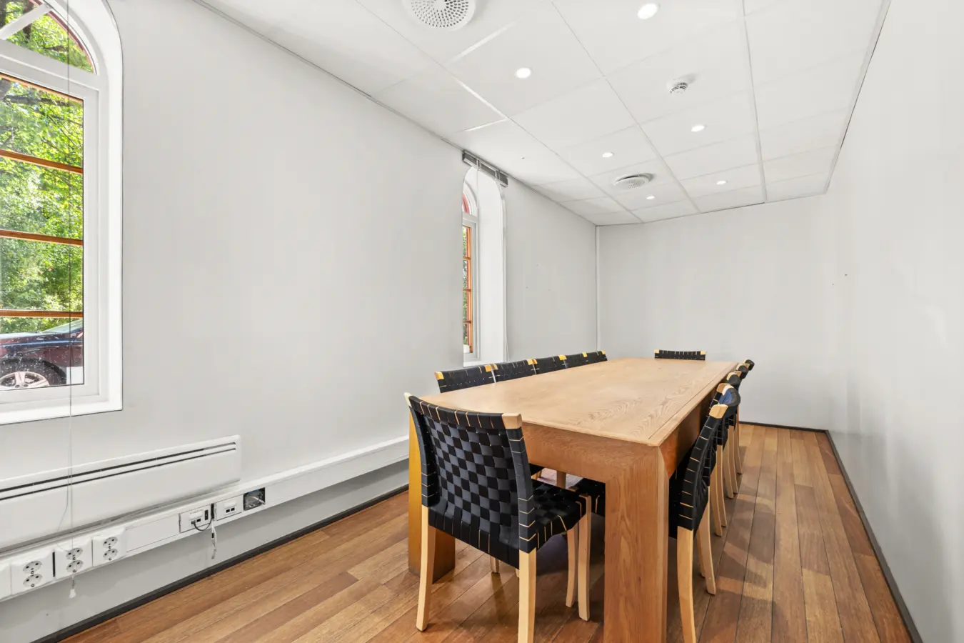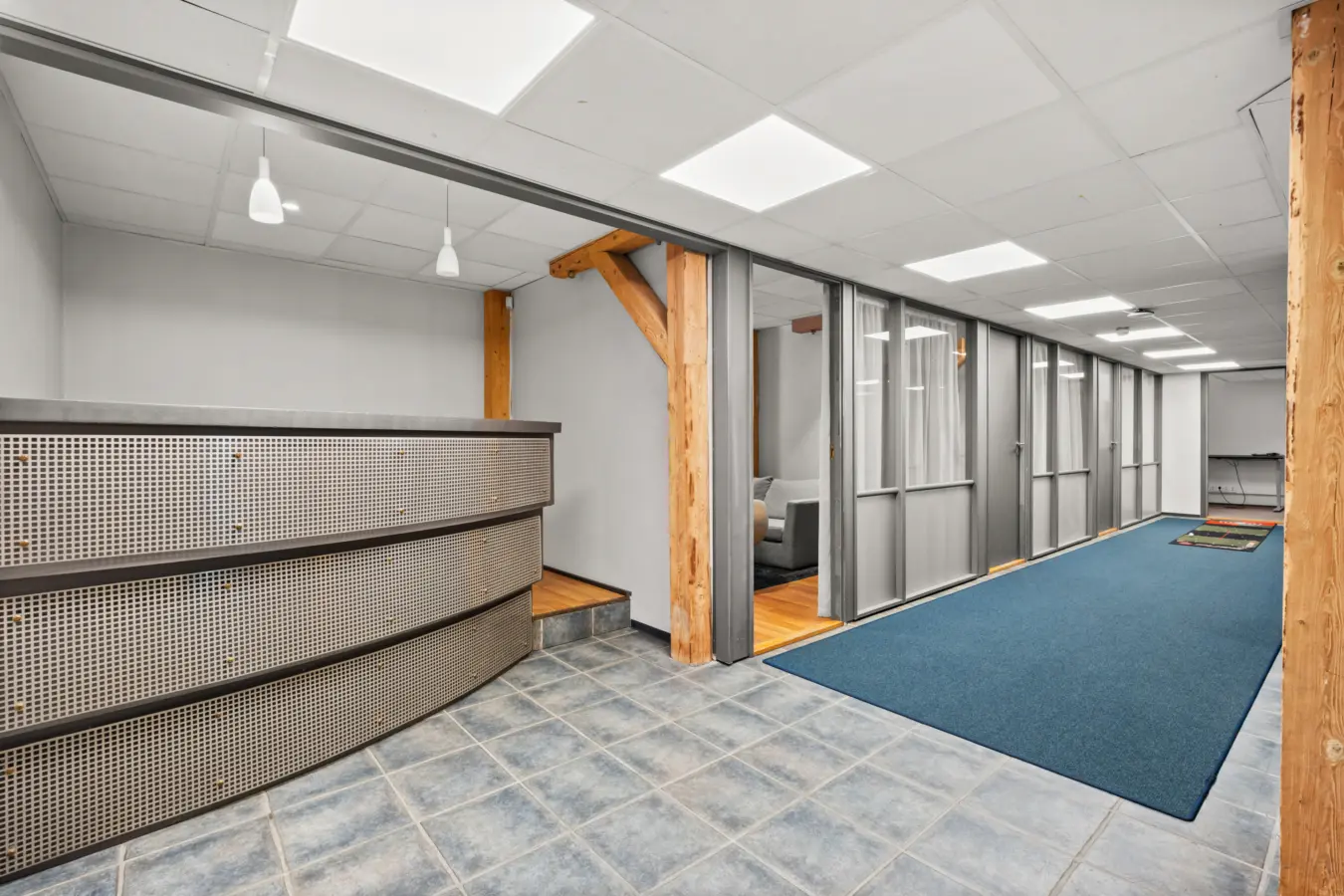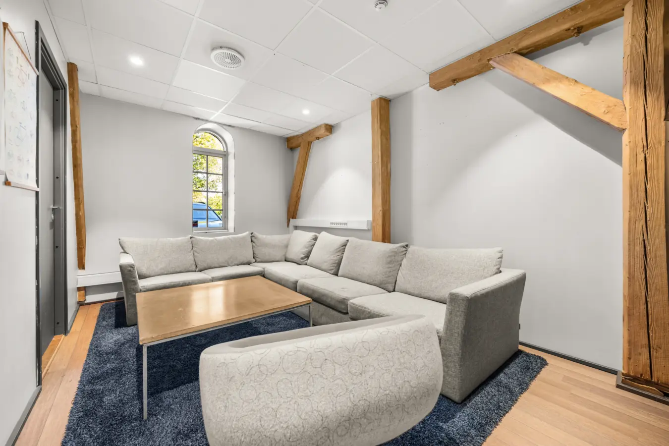 Lyst kontorlokale på 321 kvm. i 1. etasje. Lokalene kombinerer den historiske eiendommen med et moderne uttrykk – perfekt for bedrifter som ønsker både sjarm og profesjonelle fasiliteter. Lokalet har kontorer i varierende størrelse, møterom, sosiale soner, kjøkken og toaletter. Møterommene har store vindusflater som gir rikelig med dagslys og synlige bjelker som tilfører særpreg.