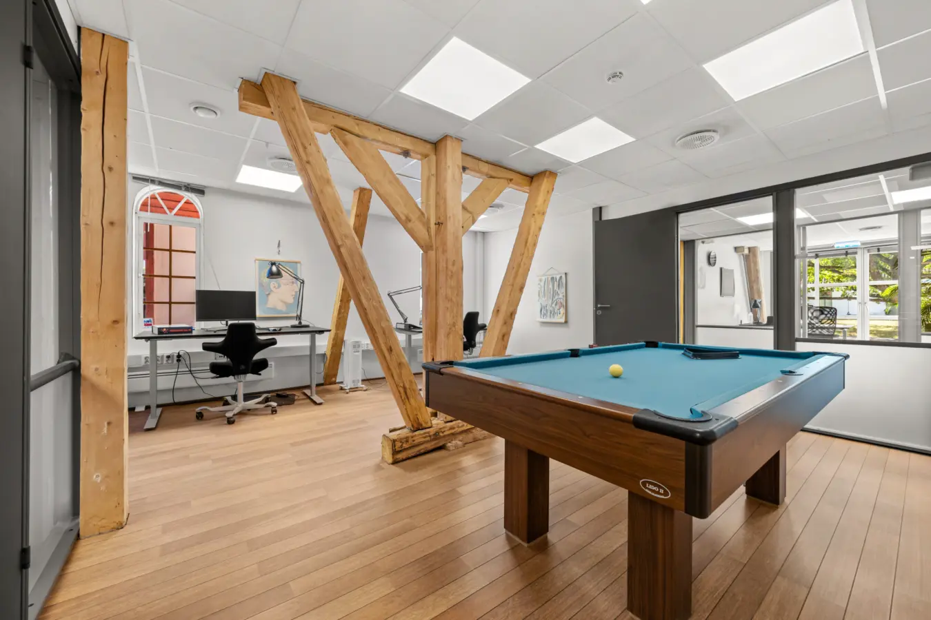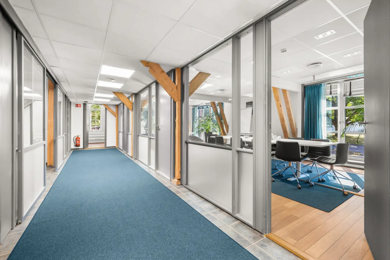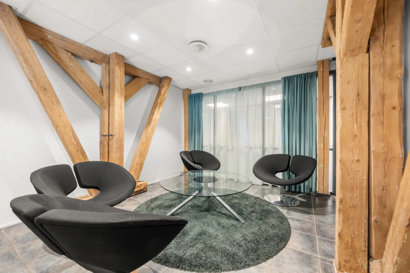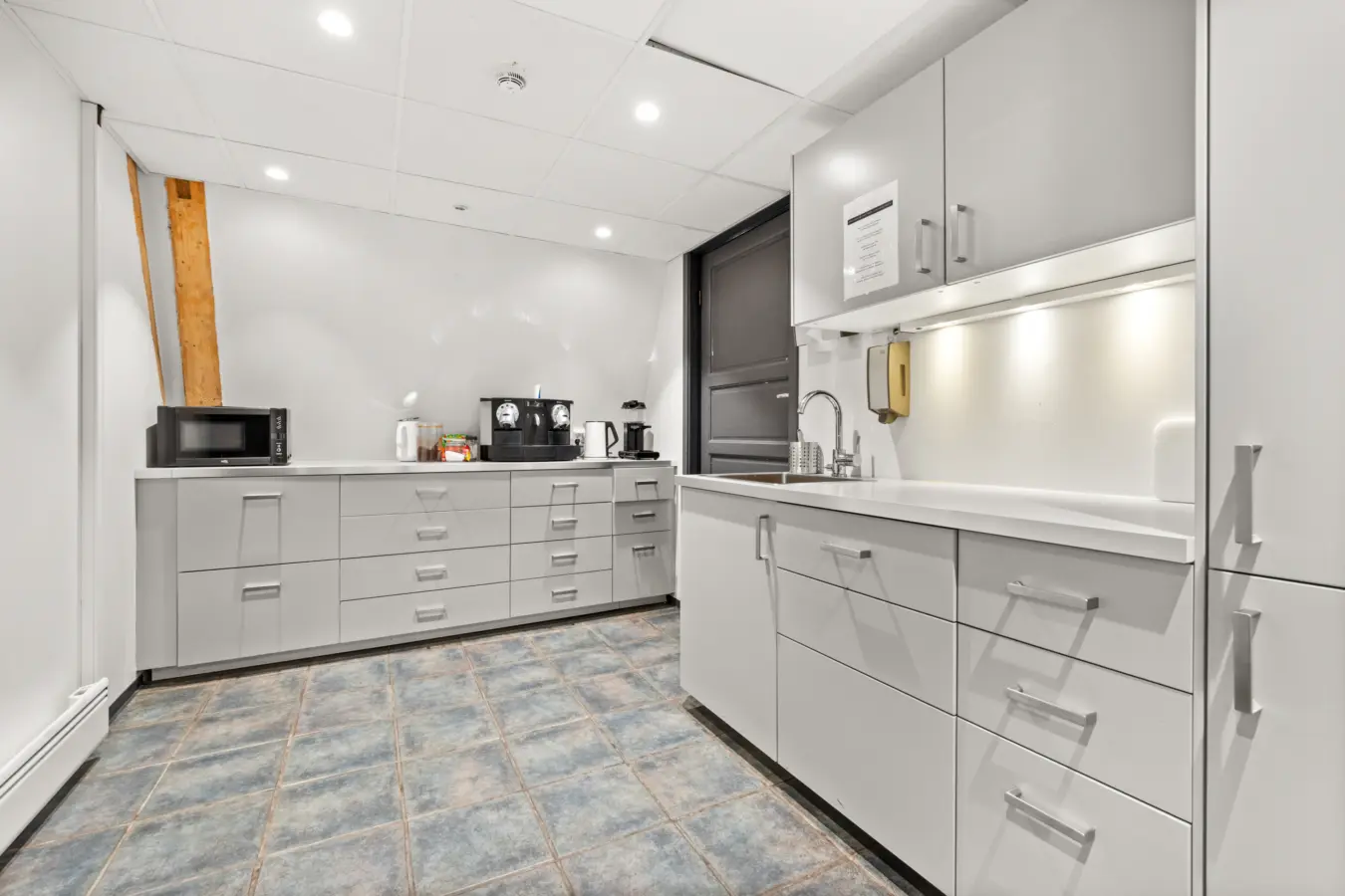 Lyst kontorlokale på 321 kvm. i 1. etasje. Lokalene kombinerer den historiske eiendommen med et moderne uttrykk – perfekt for bedrifter som ønsker både sjarm og profesjonelle fasiliteter. Lokalet har kontorer i varierende størrelse, møterom, sosiale soner, kjøkken og toaletter. Møterommene har store vindusflater som gir rikelig med dagslys og synlige bjelker som tilfører særpreg.