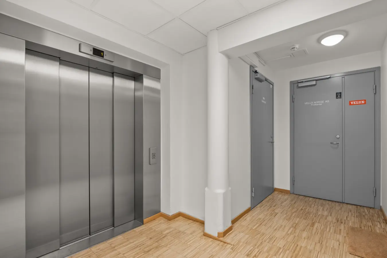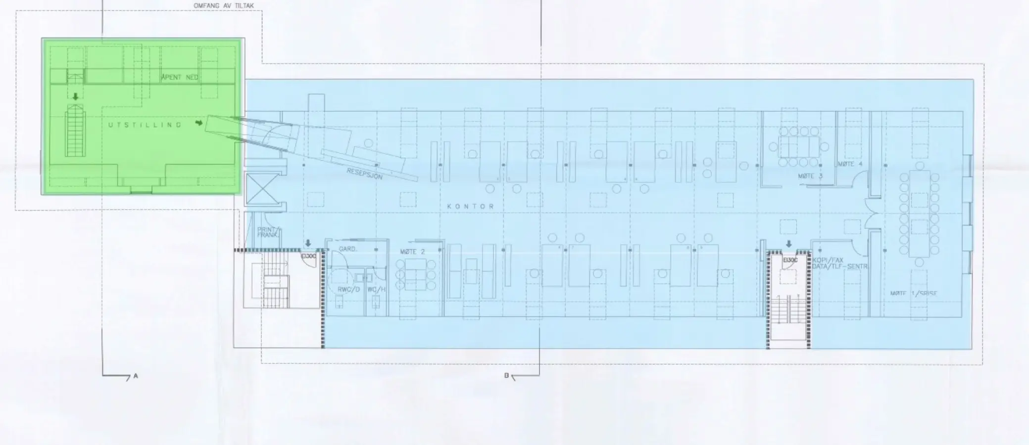 Velkomstområde med heis. Kontorlandskap og div. kontorer, møterom samt lagring. Stort møterom/spiserom med kjøkken. Garderobe og toaletter.