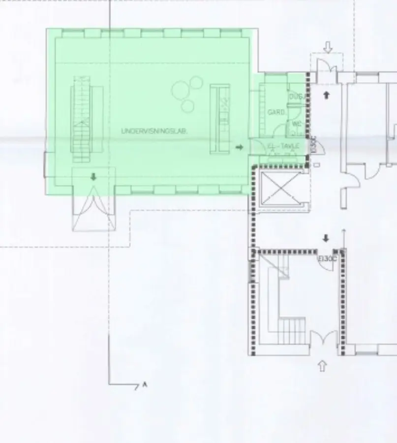 1.etg: Inngang, kontor/undervisning/showroom, garderobe med bad og toalett.