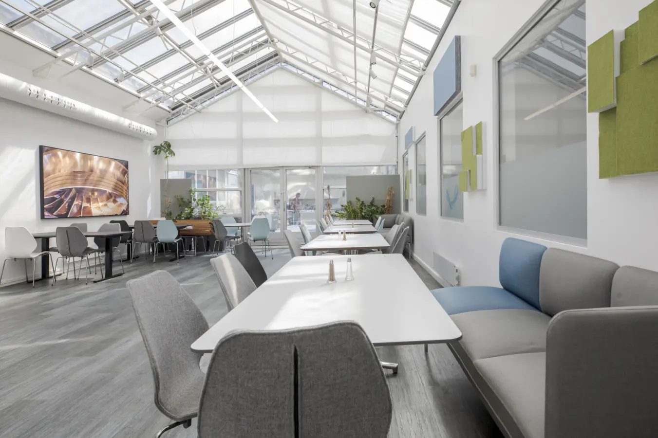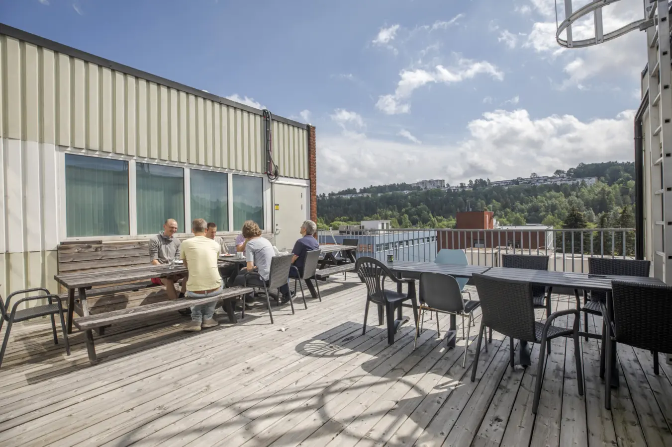 Stort spiserom/sosial sone med kjøkken og terrasse.