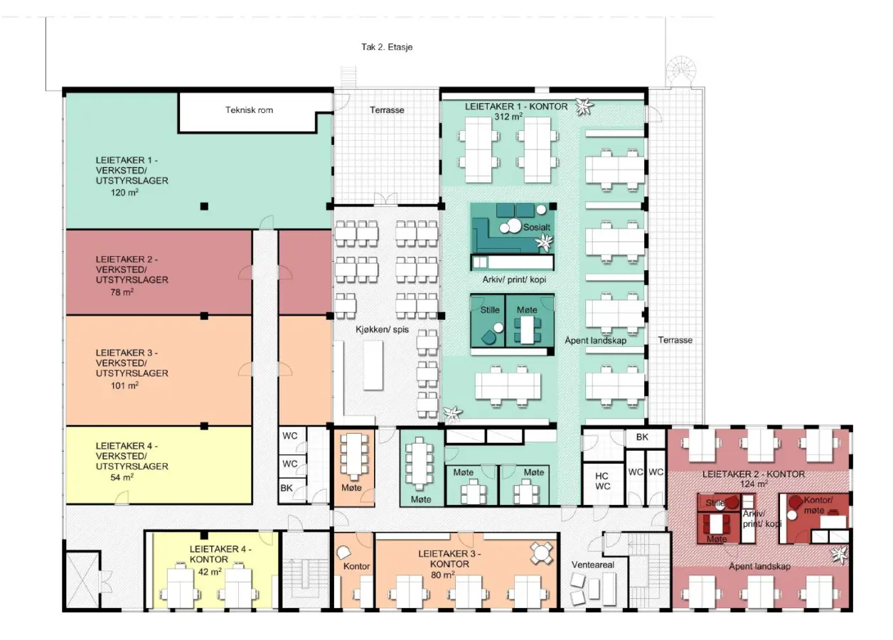 Se plantegning med forslag til forskjellige arealer.