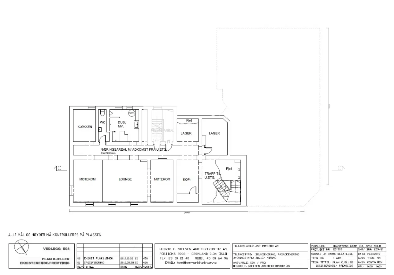 Kjeller: Etasjen har stor trapp fra underetasjen og inneholder dusj/garderobe, møterom/utstillingslokale, lager m.m.