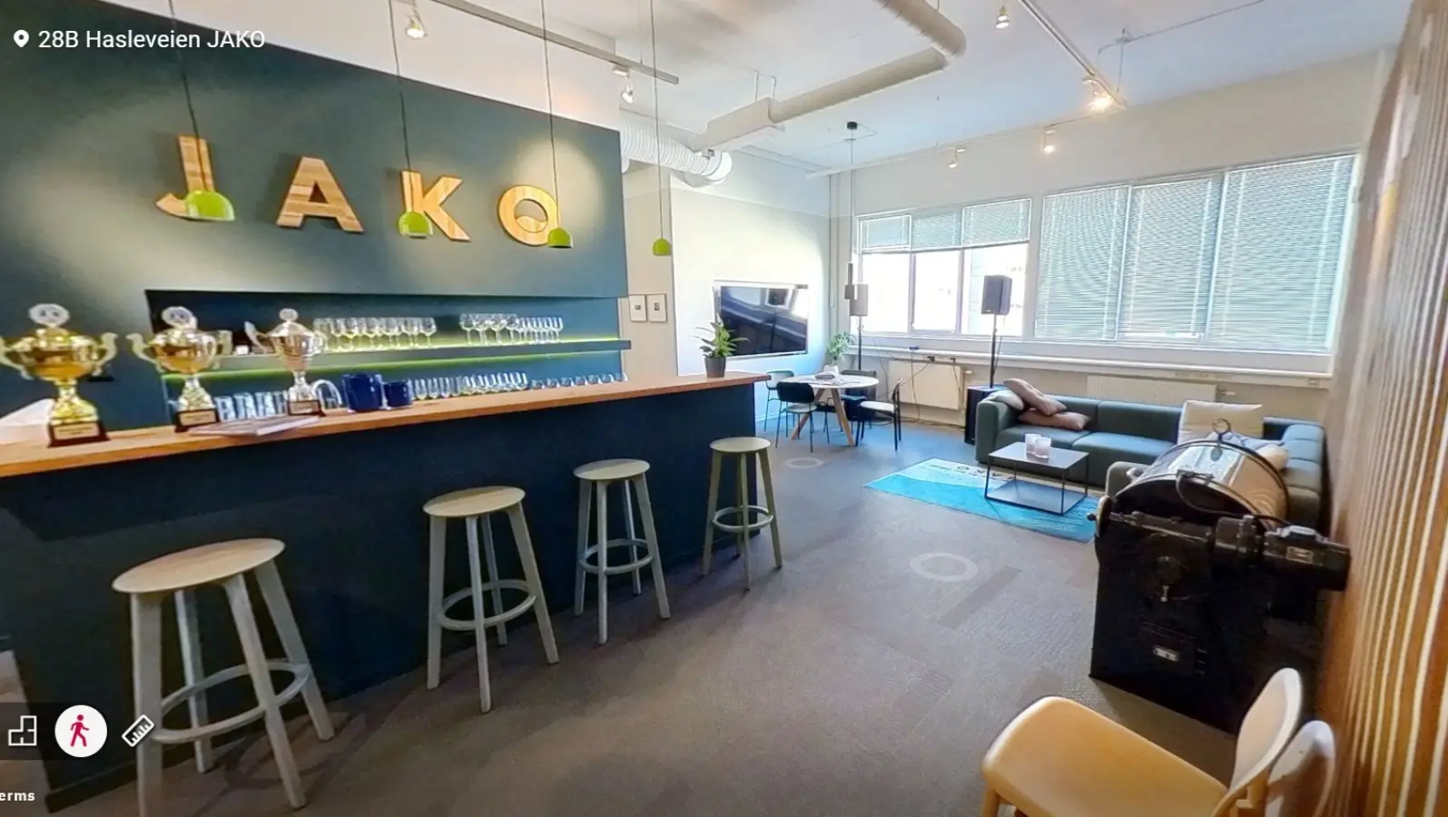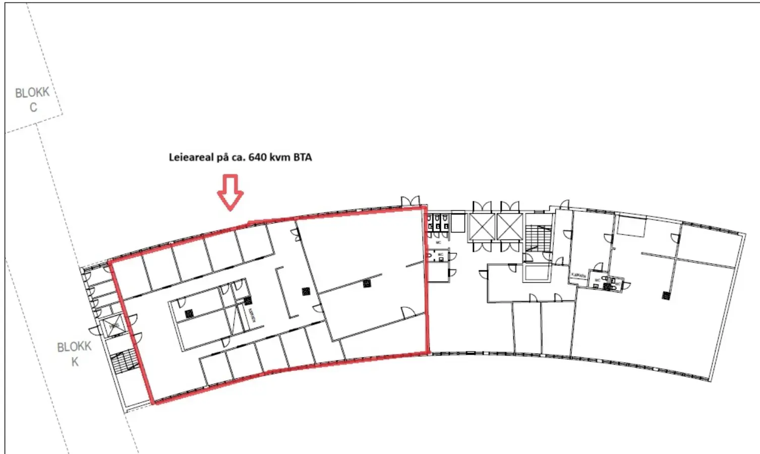 Kontordel utgjør ca. 440 kvm og lager/showroom på ca. 200 kvm av dette arealet, dette kan enkelt justeres dersom det er behov for mer lager. Kontorarealene består i dag av 10 kontorer av ulik størrelse, stort møterom, kjøkken med spiseplass, resepsjonsområdet/sosial sone og 2 toaletter.