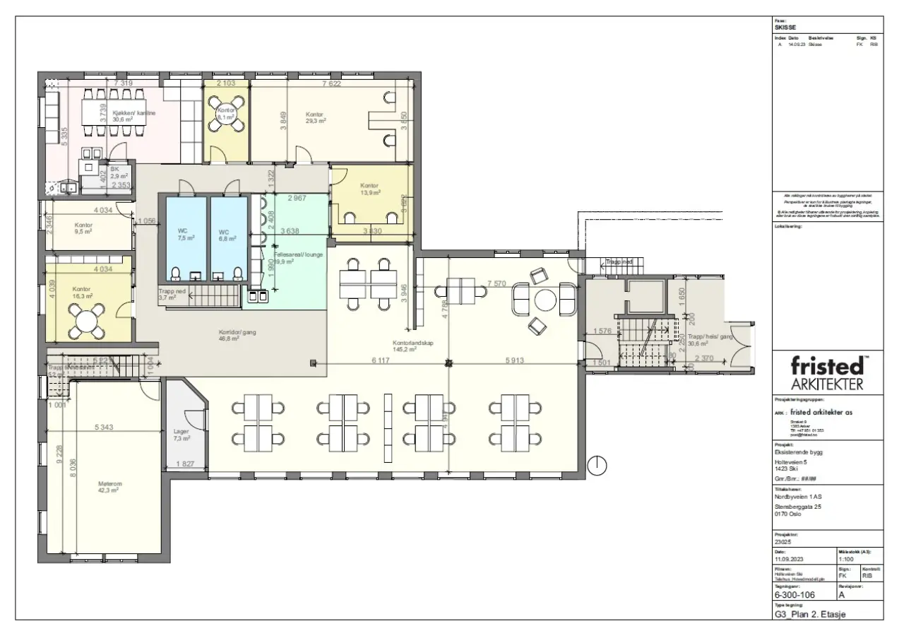 2.etg.: ca. 499,6 kvm BTA. bestående av kontorer i varierende størrelser, landskap, stort møterom, sosiale soner og kjøkken med spiseplass. Lokalene er pusset opp i nyere tid. Til dette arealet følger det mesanin etasje på ca. 42 kvm. som passer god som møterom eller lanskapsareal.