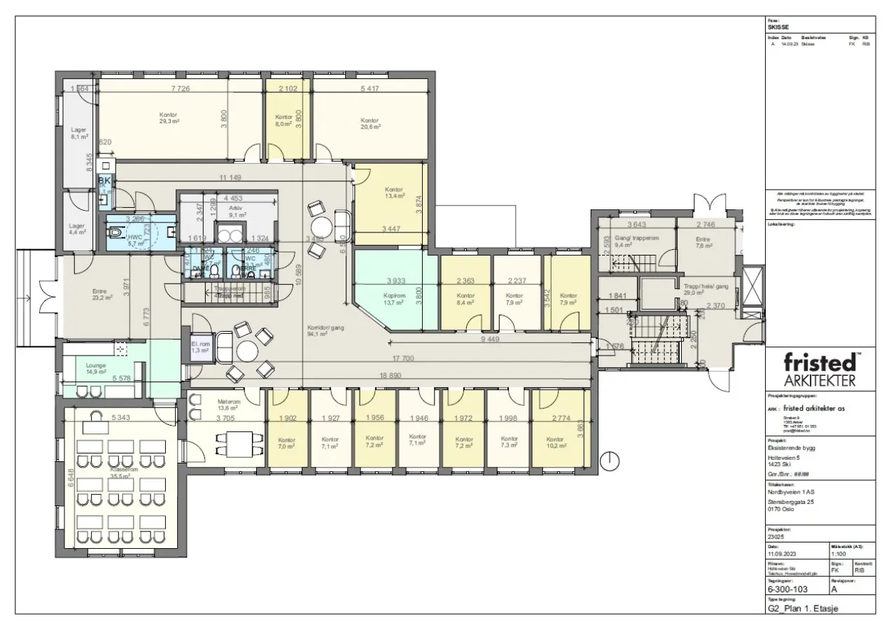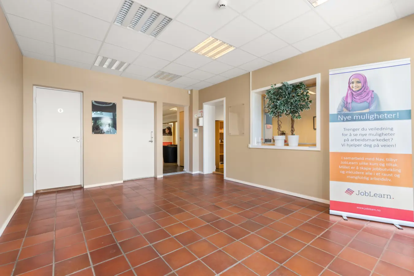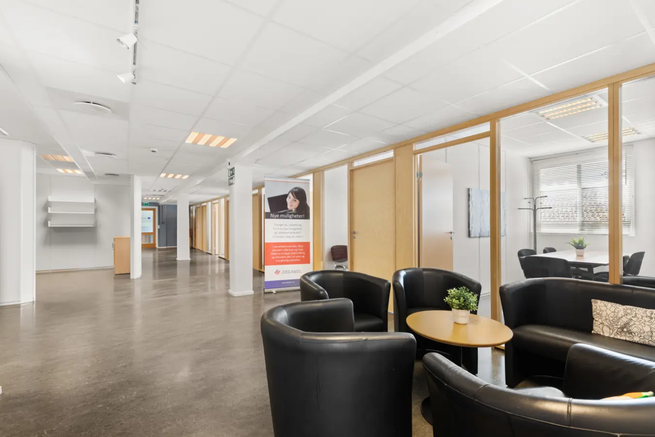 1.etg.: ca. 342 kvm BTA. bestående av 13 kontorer i varierende størrelse, møterom, kurs/konferanserom, kjøkken. Vi kan vurdere oppdeling og utleie av kontorer enkeltvis.