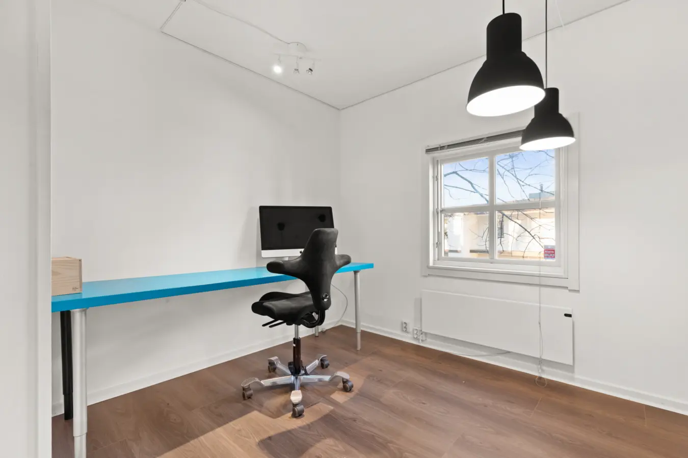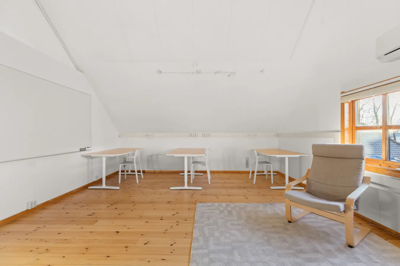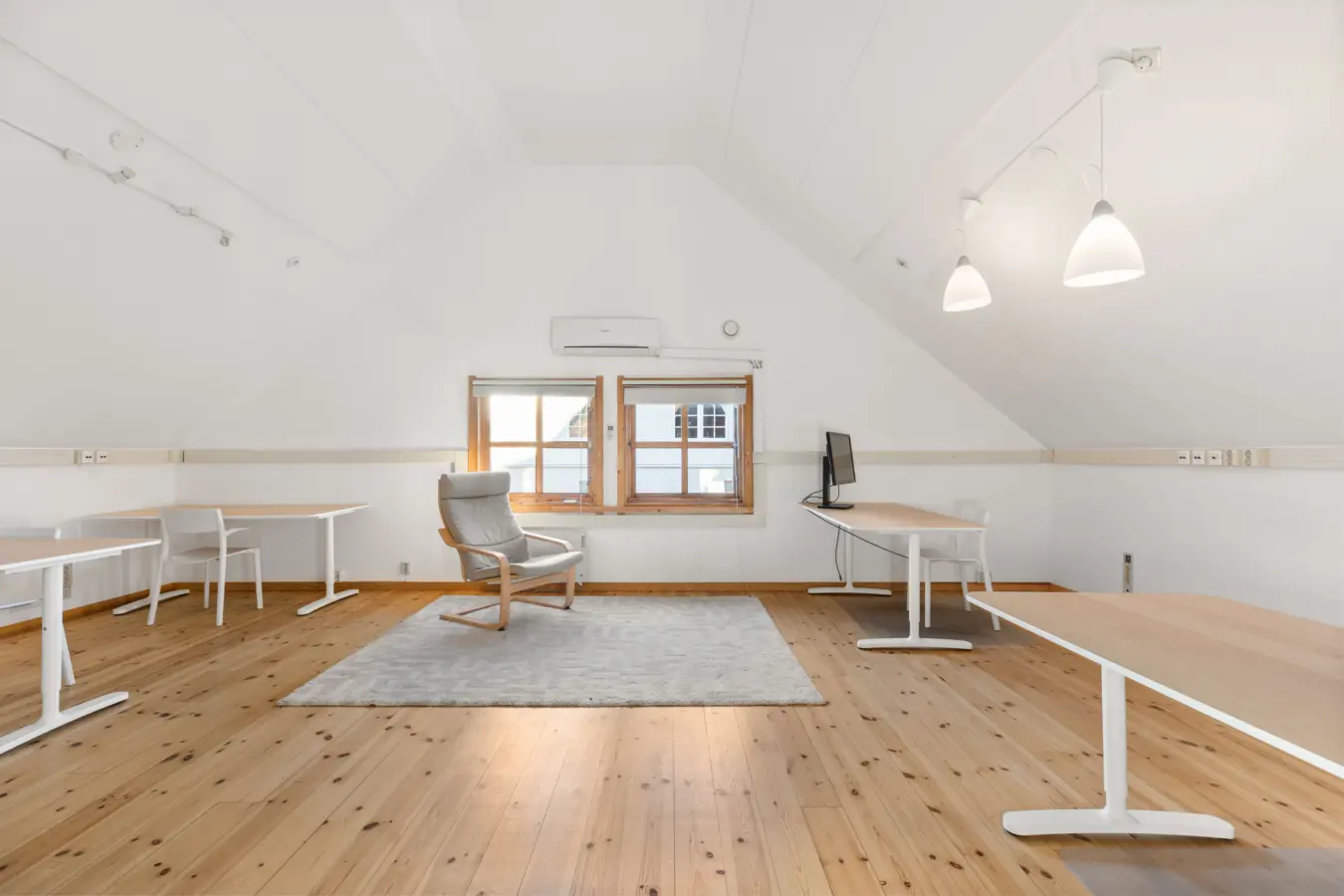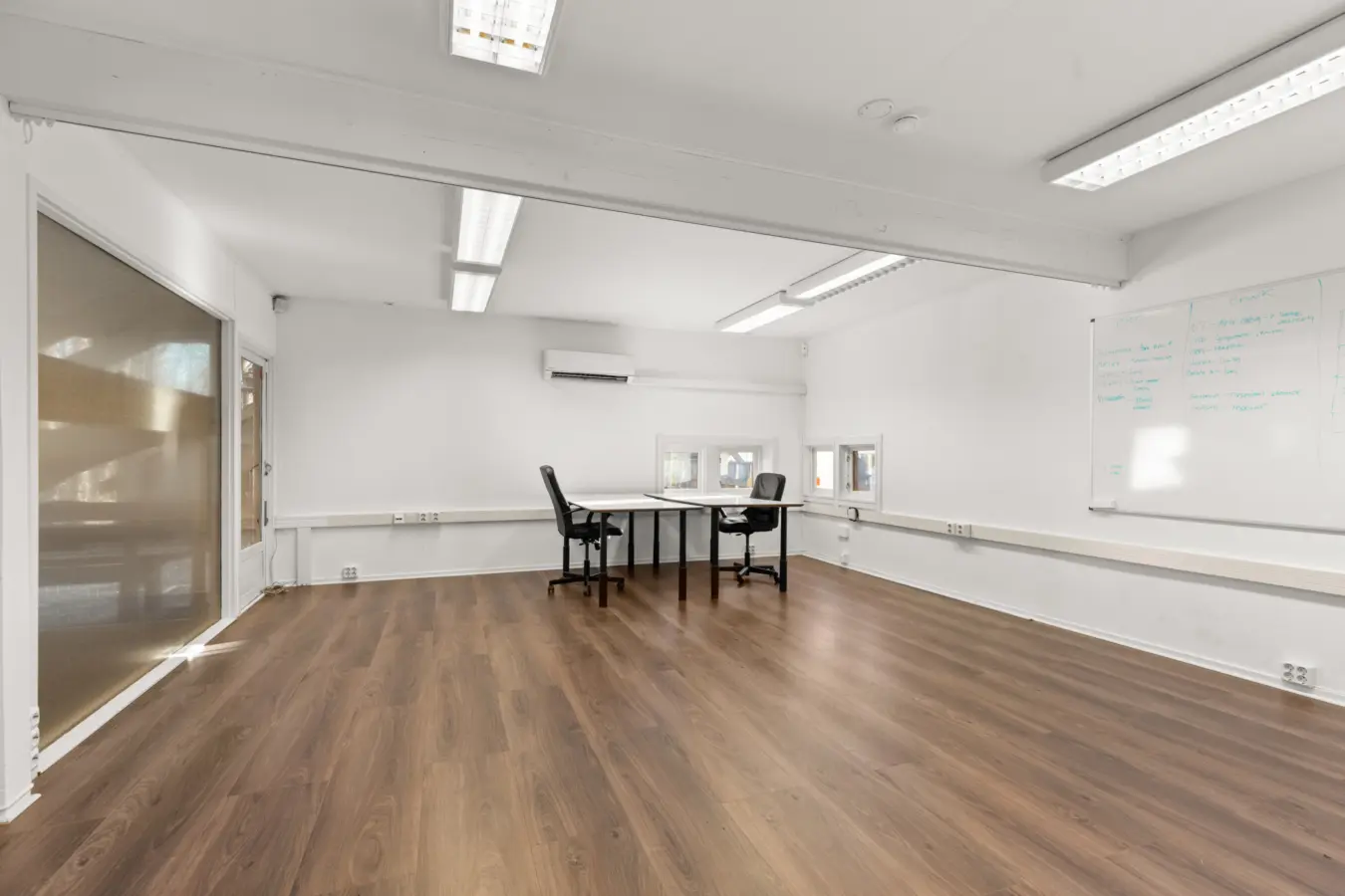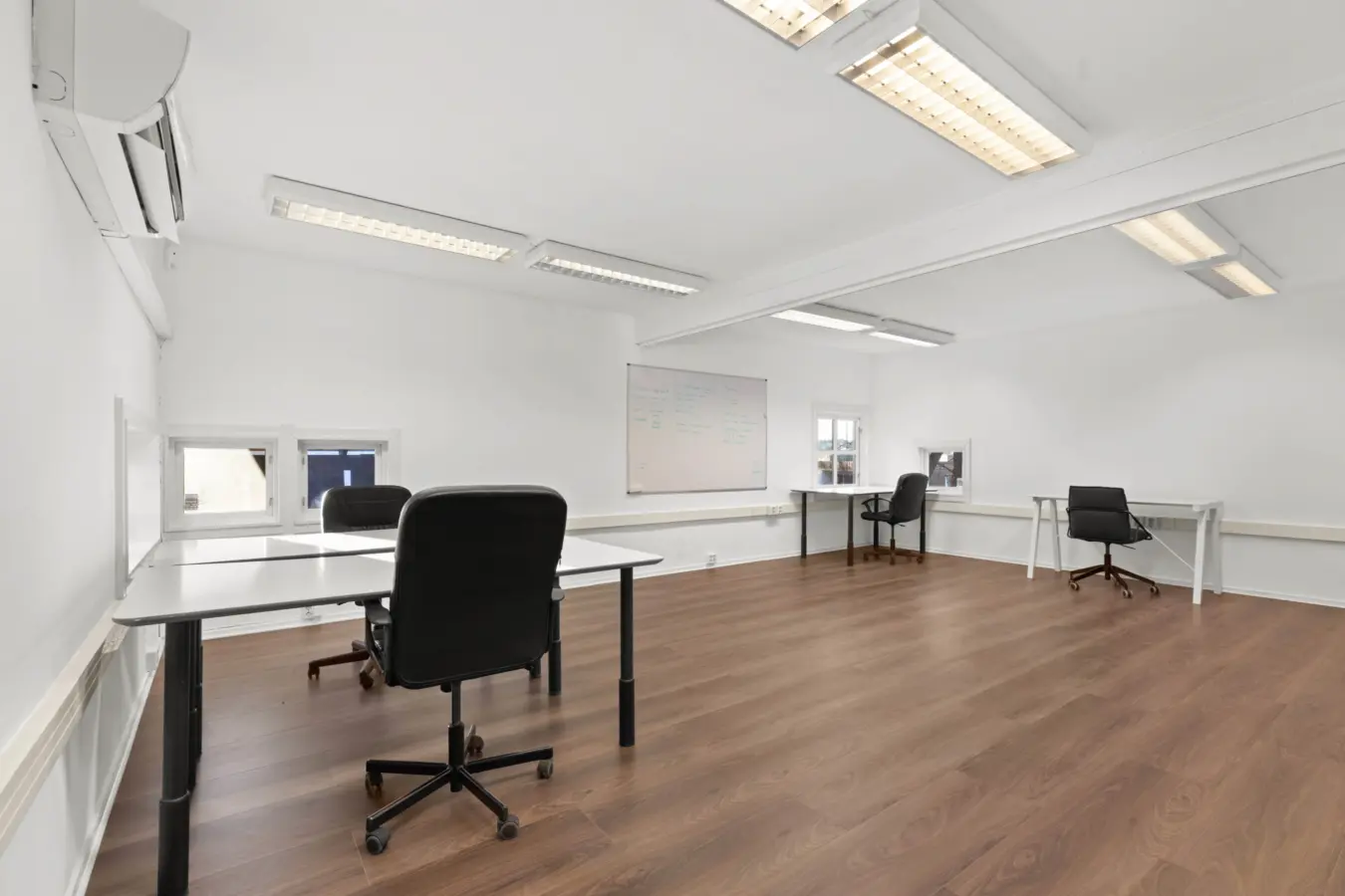 Første etasje BTA ca. 92 kvm. inneholder 2 separate kontorer, sosial sone og showrom/åpent kontorlandskap. (UTLEID)