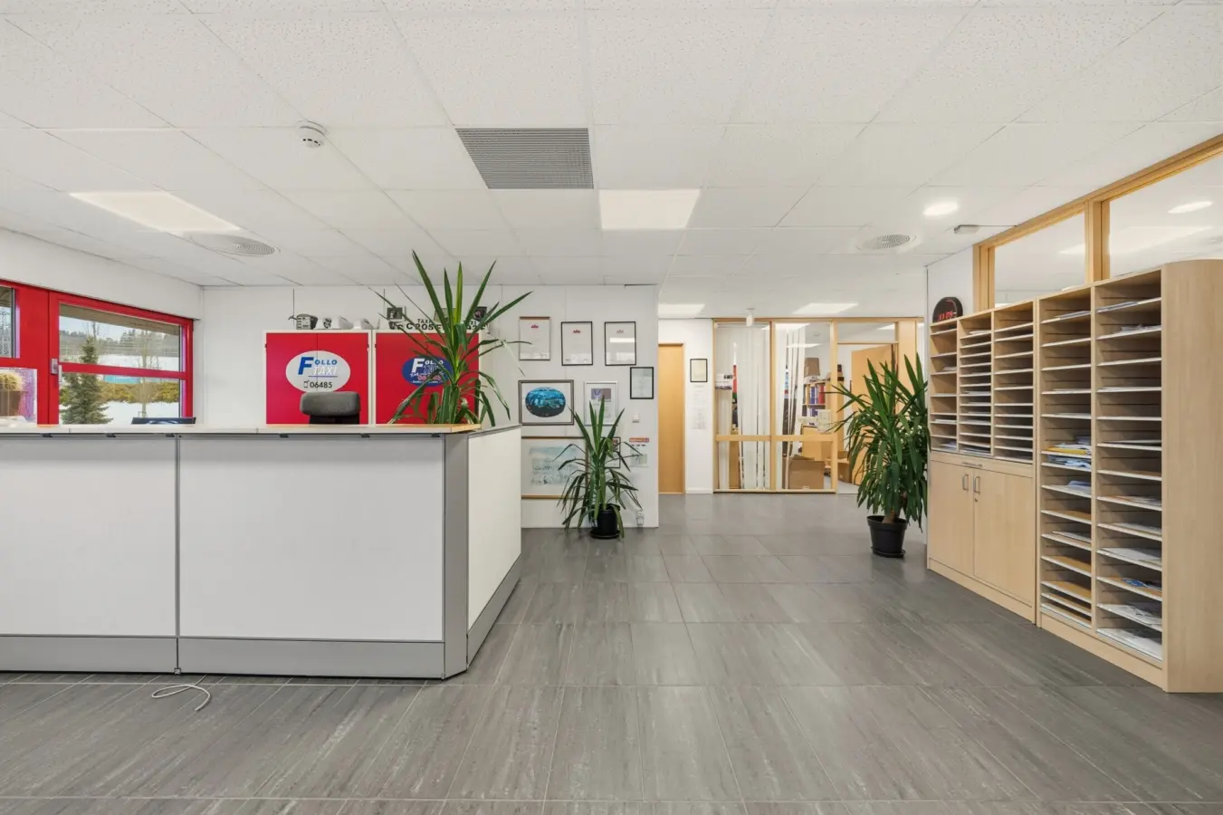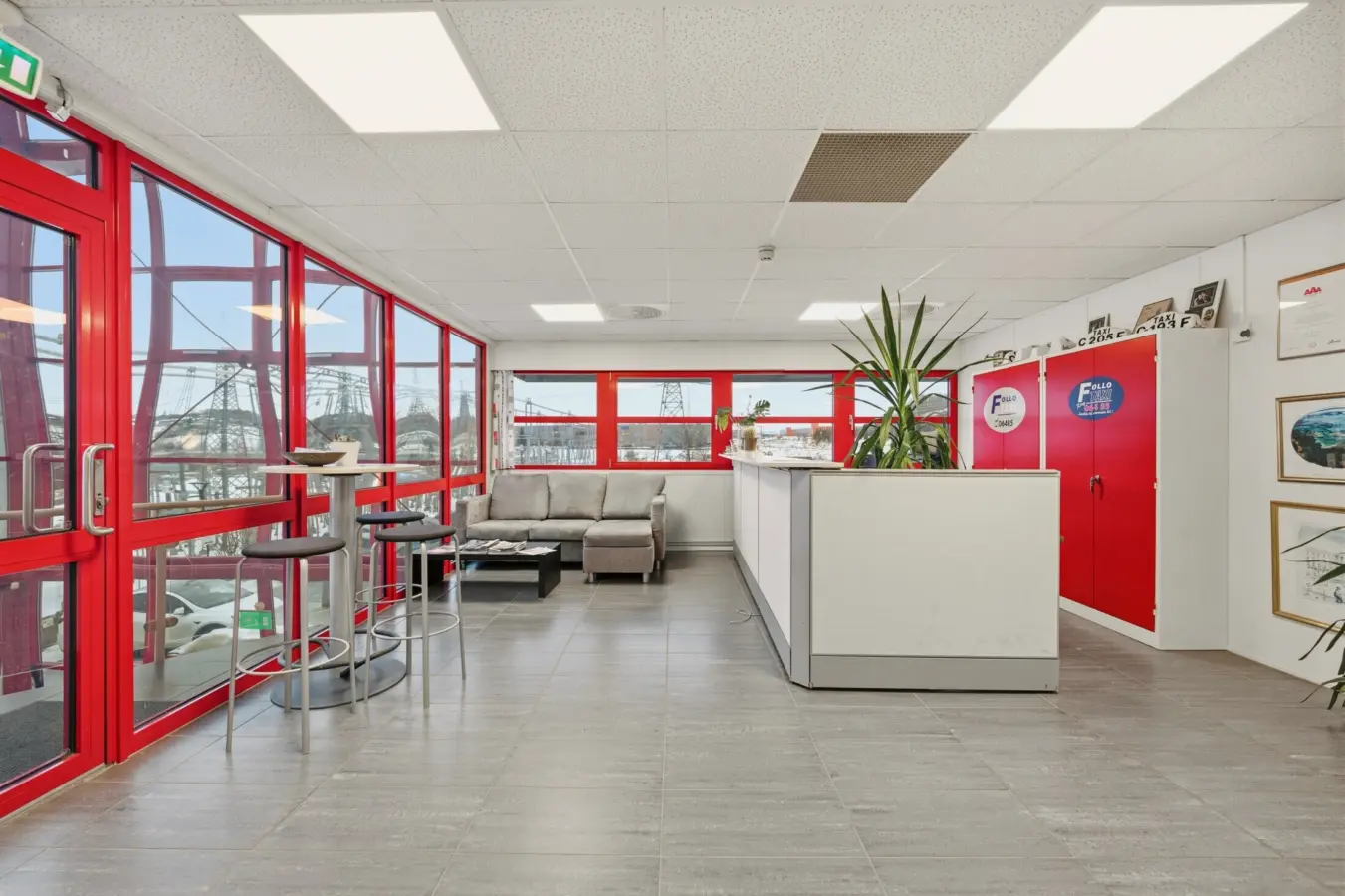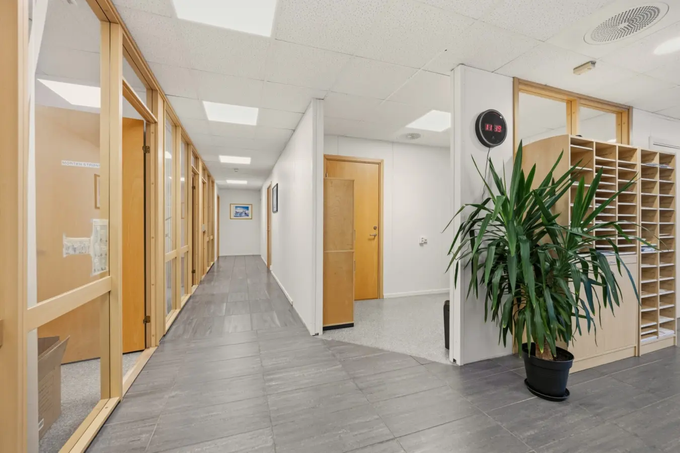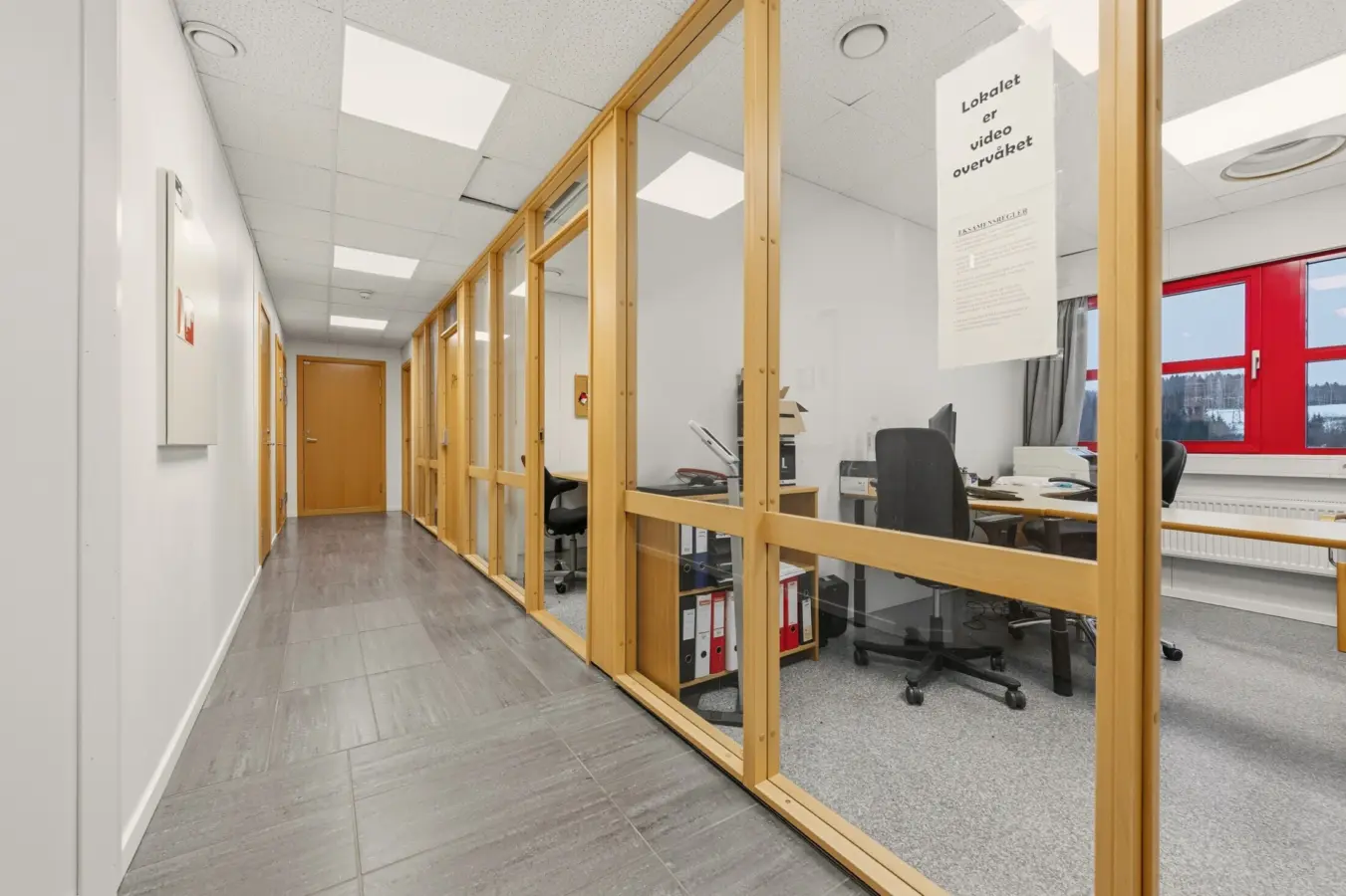 Lokalet består av resepsjon/sosial sone, 5 kontorer, 2 møterom med foldedør i mellom, kjøkken på den ene delen av møterommet, 2 stk. arkiv/lagerrom og to toaletter.